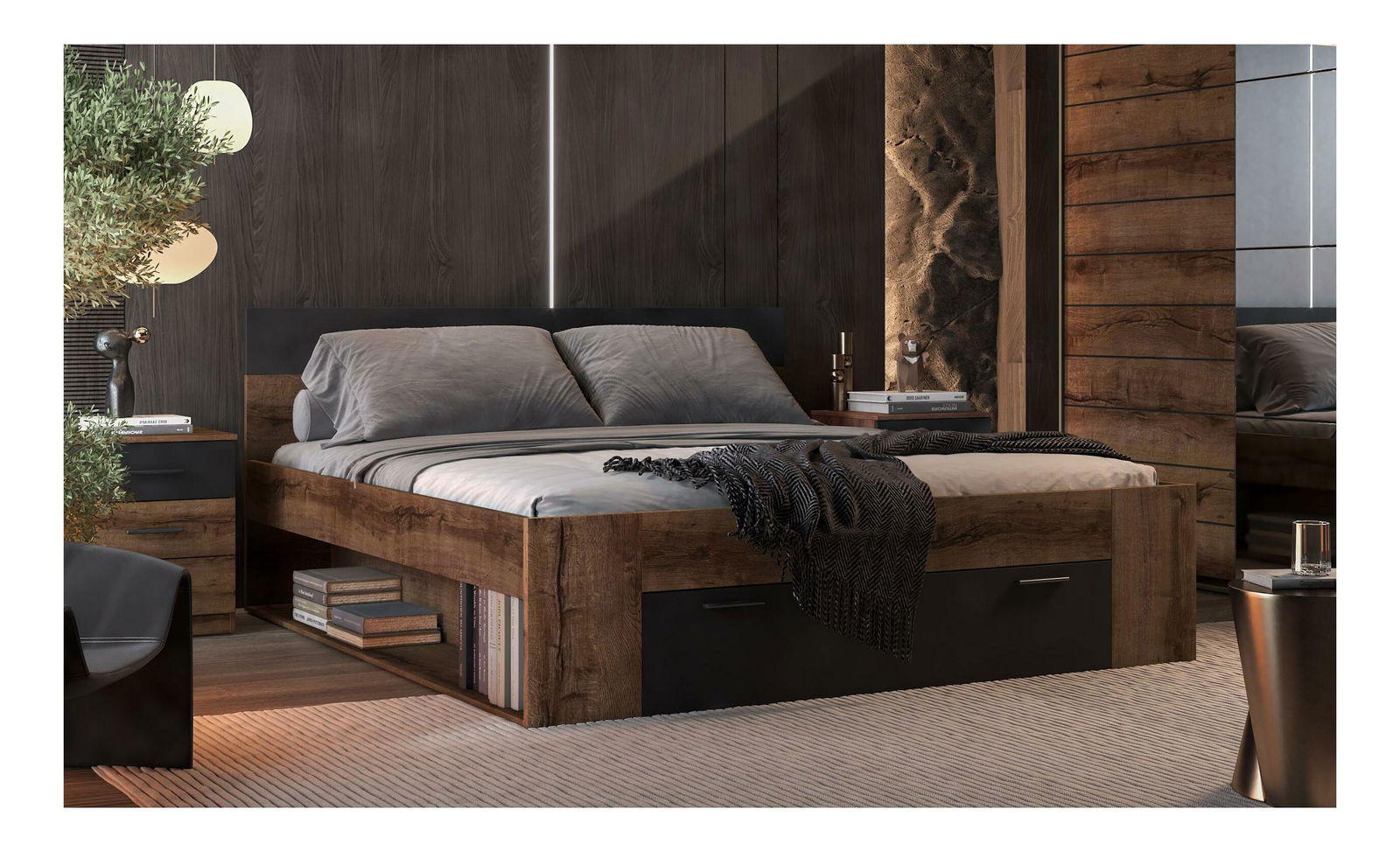 Praktická manželská postel, která nabízí úložný prostor, který se otevírá zepředu a dva otevřené odkládací prostory po stranách. Rovné čelo nabízí oporu zad při sezení na posteli a zároveň chrání stěnu před ošoupání.