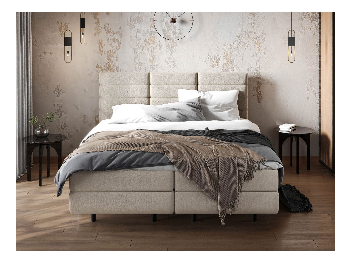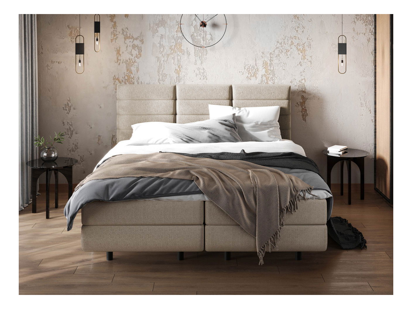Kontinentální postel je ideální volbou pro ty, kteří hledají pohodlí a styl. Kontinentální postel Crenig vám poskytne nejen vynikající komfort spánku, ale také eleganci a styl ve vaší ložnici. Byl pečlivě navržen s ohledem na nejvyšší kvalitu a vynikající vzhled. Jeho pevná konstrukce a odolné materiály zaručují odolnost a spolehlivost. Pohodlná pružinová matrace a měkké, čalouněné čelo poskytují bezkonkurenční pohodlí a podporu pro vaše tělo během spánku. Můžete si být jisti, že každá chvíle strávená na této posteli bude plná relaxace a regenerace. Kromě toho je postel v ložnici nejen pohodlná, ale také funkční. V základně má prostorné přihrádky, do kterých můžete uložit ložní prádlo, přikrývky a další předměty, čímž udržíte v místnosti pořádek. Rozměry: 140: délka: 209 cm, šířka: 148 cm, výška: 122 cm, plocha na spaní: 200 x 140 cm, rozměry jednoho úložného prostoru (postel má dva): délka: 196 cm, šířka: 67 cm, výška: 20 cm, 160: délka: 122 cm, plocha na spaní: 200 x 160 cm, rozměry jednoho úložného prostoru (postel má dva: délka: 196 cm, šířka: 77 cm, výška: 20 cm, 180: délka: 209 cm, šířka: 188 cm, výška: 100 cm, plocha na spaní: (postel má dva): délka: 196 cm, šířka: 87 cm, výška: 20 cm Provedení: pevný rám: 16 mm silná lamino deska + smrkové dřevo + 5 mm HDF deska, čelo postele: surová deska tloušťka 15 mm + dřevo + vata 810G/M2, polyuretanová pěna, stupeň tvrdosti: H3, topper (matracová plocha) 5 cm: pěna se zvýšenou pružností, prošívaný potah, oboustranný, stupeň tvrdosti: H2, černé plastové nohy, výška 13,5 cm, dva úložné prostory (na každé straně postele), plynové zvedáky pro snadné otevírání
