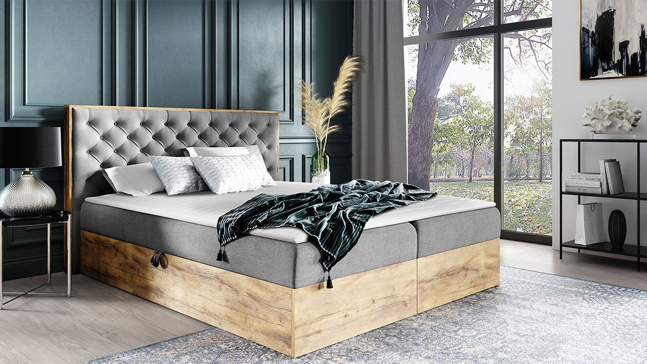 Kontinentální postel je ideální volbou pro ty, kteří hledají pohodlí a styl. Elegantní kontinentální postel se 2 úložnými prostory Maradis 3 je základem pohodlného odpočinku. Pohodlí během spánku zajišťuje několik vrstev matrace včetně topperu. Ten chrání hlavní matraci před poškozením, čímž prodlužuje její životnost a spolehlivost. Elegantní vzhled postele tvoří pečlivě vybrané komponenty. Základnu ve vzorech dřeva doplňují čalouněné vložky. Čalounění matrace a ozdobně prošívaný podhlavník jsou prvky, které podtrhují výjimečný vzhled celého nábytku. Ze široké škály barev čalounění si můžete vybrat tu, která se nejlépe hodí do interiéru vaší ložnice. Další výhodou postele Madaris 3 jsou její 2 úložné prostory. Prostory, které jsou k dispozici pod matrací, poskytují vynikající úložný prostor pro polštáře, přikrývku a náhradní deky pro chladnější večery. Dostupné rozměry: 120: délka: 211 cm, šířka: 130 cm, výška: 105 cm, plocha na spaní: 120 x 200 cm, rozměry jednoho úložného prostoru (postel má dva): délka: 197 cm, šířka: 57 cm, výška: 25 cm, 140: 105 cm, plocha na spaní: 140 x 200 cm, rozměry jednoho úložného prostoru (postel má dva): délka: 197 cm, šířka: 67 cm, výška: 25 cm, 160: délka: 211 cm, šířka: 170 cm, výška: 105 cm, plocha na spaní: (postel má dva): délka: 197 cm, šířka: 77 cm, výška: 25 cm, 180: délka: 211 cm, šířka: 190 cm, výška: 105 cm, plocha na spaní: 180 x 200 cm, rozměry jednoho úložného prostoru (postel má dva): délka: 1 200: délka: 211 cm, šířka: 210 cm, výška: 105 cm, plocha na spaní: 200 x 200 cm, rozměry jednoho úložného prostoru (postel má dva): délka: 197 cm, šířka: 97 cm, výška: 25 cm Provedení: Úložný prostor: 16 mm mm surová deska + vysoce elastická pěna T25, má dva kontejnery na lůžkoviny - postel má standardně dva kontejnery na lůžkoviny na obou stranách postele, přičemž obě části se zvedají díky pružinám, což velmi usnadňuje manipulaci, hlavní matrace: pružiny typu bonell + vysokoelastická pěna T25, stupeň středně pevná, na samém vrchu - vrchní matrace (Mandula topper): středně pevná, tloušťka přibližně 2,5 cm, prošívaný potah, topper vyrobený z hypoalergenních materiálů nejvyšší kvality: antibakteriální a protiplísňová polyesterová pletenina s gramáží 200 g/m² přiměřenou tvrdostí a pružností, nízkou náchylností k deformaci, vysokým komfortem používání, vysoce nadýchané rouno 100 g/m² z polyesterového vlákna, fleec s gramáží 35 g/m² vyrobený z vysoce kvalitní netkané textilie, polyesterové mikrovlákno s gramáží 82 g/m²: bariéra proti prachu a roztočům, topper má 4 pevné upevňovací gumy, které zabraňují pohybu matrace, lem: po obvodu olemovaný páskou, oboustranné - obě strany poskytují použitelný povrch, doporučuje se matraci otáčet každé 2-3 měsíce, lze prát při 30˚C nožičky: plastové, postel není volně