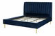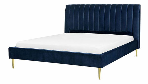 Elegantní postel v moderním stylu s vysokým a hrubě vyztuženým opěradlem. Klasický obdélníkový tvar postele doplňuje prošívané čelo, které posteli dodává moderní vzhled. Nohy jsou perfektně vyvážené a neodvádějí pozornost od elegantního designu, ale zajišťují silnou, pevnou a odolnou konstrukci. Celá postel je čalouněna tmavě modrým sametem, který jí dodává sofistikovaný vzhled.