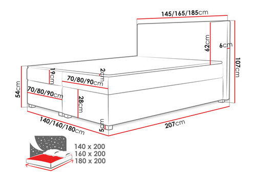 délka: 207 cm, šířka: 165 cm, výška : 107 cm, plocha na spaní: 160 x 200 cm