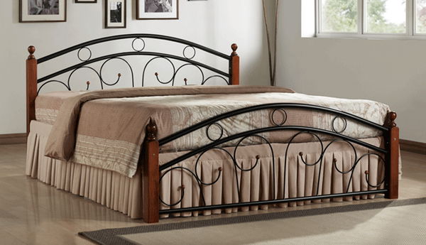 Elegantní postel ve klasickém stylu se zajímavou kombinací dřeva a kovu. Kvalitní masivní dřevo je v barevném provedení antická třešeň. Rám je kovový, tak jako i originální mříže černé barvy na předním a zadním čele postele. Podélné dřevěné lamely jsou vsazeny do kovového rámu. Rošt je cca 33-34 cm nad zemí. Výška čela při hlavě je 95,2 cm a u nohou 52 cm.