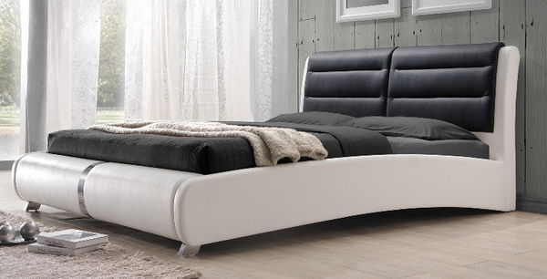 Elegantní postel originálního vzhledu s vysokým čelem vhodná spíše do moderneji zařízené ložnice. Konstrukce je z kvalitního přírodního dřeva čalouněná ekokůží bílé barvy v kombinaci s černou. Rošt je v ceně a jeho výška nad zemí je cca 24 cm.