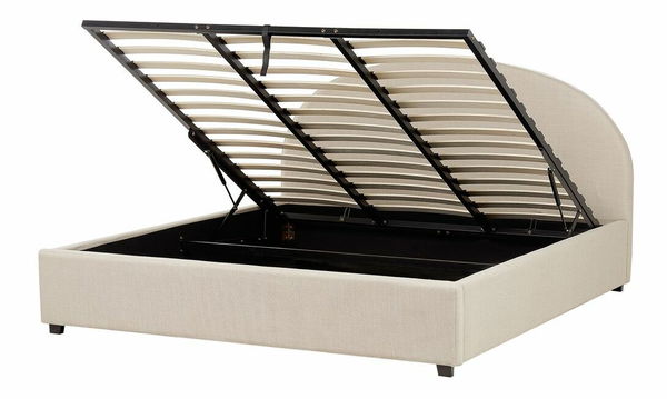 Zaoblené tvary a látkové čalounění s bohatou strukturou vytvářejí design, který je ideální do ložnic zařízených v retro stylu. Postel je čalouněna látkou béžové barvy, která je příjemná na dotek, snadno se udržuje a je trvanlivá. Díky zaoblenému čalouněnému čelu příjemně zútulní vaši ložnici. Postel má také úložný prostor, který je vhodný pro odkládání polštářů nebo ložních přikrývek.