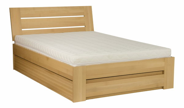 Manželská postel, v níž se skloubil jednoduchý design s praktičností. Skloněné čelo dodává posteli jedinečný styl. Postel má výklopný kovový rám s roštem na matraci a praktický úložný box na ložní prádlo, vyrobený z dřevotřísky.