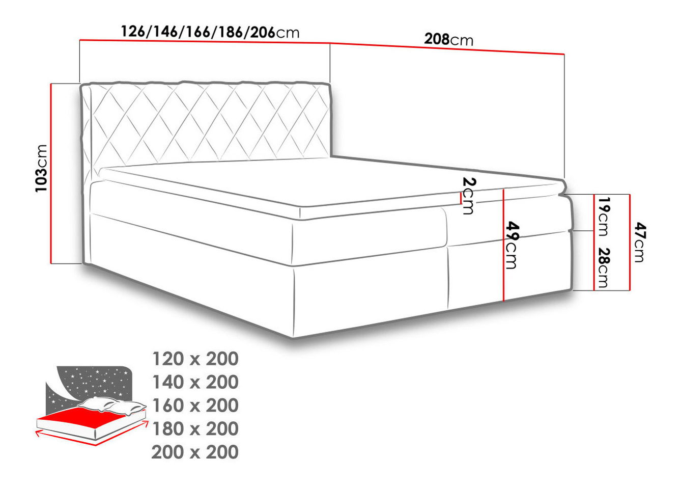 Kontinentální postel je ideální volbou pro ty, kteří hledají pohodlí a styl. Narcyz je moderní a velmi pohodlná kontinentální postel. Je k dispozici v několika univerzálních barvách a velikostech, díky nimž se dokonale přizpůsobí místnosti. Tato postel má dva kontejnery na ložní prádlo – na obou stranách postele. Zvedají se pomocí pružin, díky čemuž je otevírání nádob velmi snadné a pohodlné. Kontinentální postel Narcyz má matraci s bonell pružinami střední tvrdosti a vrchní část vyrobenou z vysoce elastické pěny. Dostupné rozměry: 120 - délka: 208 cm, šířka: 120 cm, výška: 103 cm, plocha na spaní: 120 x 200 cm, 140 - délka: 208 cm, šířka: 140 cm, výška: 103 cm, délka na spaní: 140 x 20 160 cm, výška: 103 cm, plocha na spaní: 160 x 200 cm, 180 - délka: 208 cm, šířka: 180 cm, výška: 103 cm, plocha na spaní: 180 x 200 cm, 200 - délka: 208 cm, šířka: 20 x 200 cm Provedení: vrchní část - topper (vrchní matrace), vstup: pěna - vysoce odolná pěna 3 cm (vyznačující se mimořádnou elasticitou, pružností i prodyšnost), prošívaný potah - zip tvaru C, výška vrchní části cca 5 cm, tělo: laminovaná deska + je čalouněný silnější vláknitou tkaninou - fibertex, má dva kontejnery na ložní prádlo - postel se dvěma nádobami na ložní prádlo jako standard, na obou stranách postele, zvedání obou částí díky pružinám, což dělá obsluhu velmi jednoduchou a lehkou, má pružiny typu bonell, má pružiny typu bonell (vyznačující se mimořádnou elasticitou, pružností i prodyšností) Možnost nákupu: Noční stolek Umaru v barevném provedení jako postel Rozměry úložného prostoru: výška: 25 cm délka: 197 cm šířka: 120 / 200 - 56,5 cm 140 / 250 - 6 cm 180 / 200 - 86,5 cm 200 / 200 - 96,5 cm Záruka: 24 měsíců