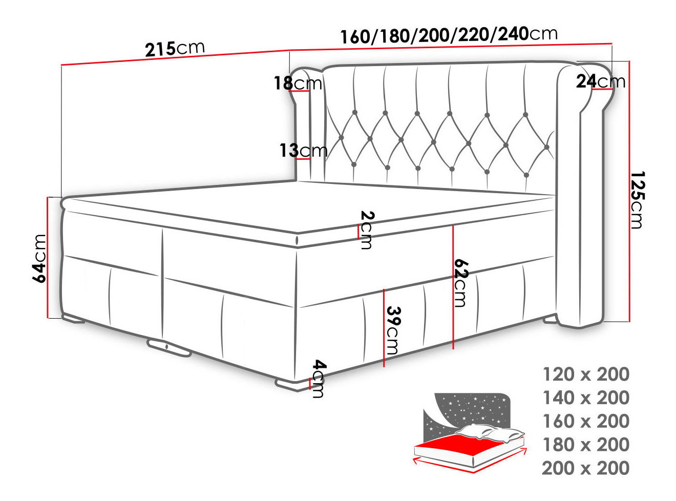 Postel je ideální volbou pro ty, kteří hledají pohodlí a styl. Kontinentální postel Piuret se vyznačuje moderním designem, masivní konstrukcí a vysokou kvalitou použitých materiálů, které budou své uživatele těšit bezvadným vzhledem postele dlouhá léta. Konstrukce postele do ložnice je založena na pevném základě, ve kterém jsou prostorné přihrádky na lůžkoviny, pohodlná matrace Pocket spring, čalouněné čelo a topper - povrchová matrace zvyšující pocit pohodlí a relaxu. Kontinentální postel Piuret je vybavena chromovými nohami, které dodávají celku charakter a mají možnost výběru barev z možností dostupných v produktové kartě. Dostupné rozměry: - 120 - délka: 215 cm, šířka: 160 cm, výška: 125 cm, plocha na spaní: 120 x 200 cm, - 140 - délka: 215 cm, šířka: 180 cm, výška: 125 cm, plocha na spaní: 140 x 2 šířka: 200 cm, výška: 125 cm, plocha na spaní: 160 x 200 cm, - 180 - délka: 215 cm, šířka: 220 cm, výška: 125 cm, plocha na spaní: 180 x 200 cm, - 200 - délka: 215 cm, šířka: spaní: 200 x 200 cm Provedení: postel není volně stojící, záda jsou čalouněná postel se dvěma úložnými prostory na ložní prádlo jako standard, na obou stranách postele, zvedání obou částí díky pružinám, dělá obsluhu velmi jednoduchou a lehkou, pružiny m2, (kosterní systém je dobře podepřený a přirozené zakřivení těla zachováno), vysoce flexibilní pěna T30, tvrdost matrace (střední vrstva postele): H2/H3, pěna - vysoce flexibilní pěna 3 cm (vyznačující se mimořádnou elasticitou, pružností a zároveň prodyšností), prošívaná 5 cm, Ostatní: chromované nohy Možnost nákupu: Noční stolek Umaru v barvách postele Rozměry úložného prostoru: výška: 33 cm délka: (úložný prostor je rozdělen na dvě části): 120 / 200 – 57 x 197 a 57 x 197 190 / 200 Záruka: 24 měsíců