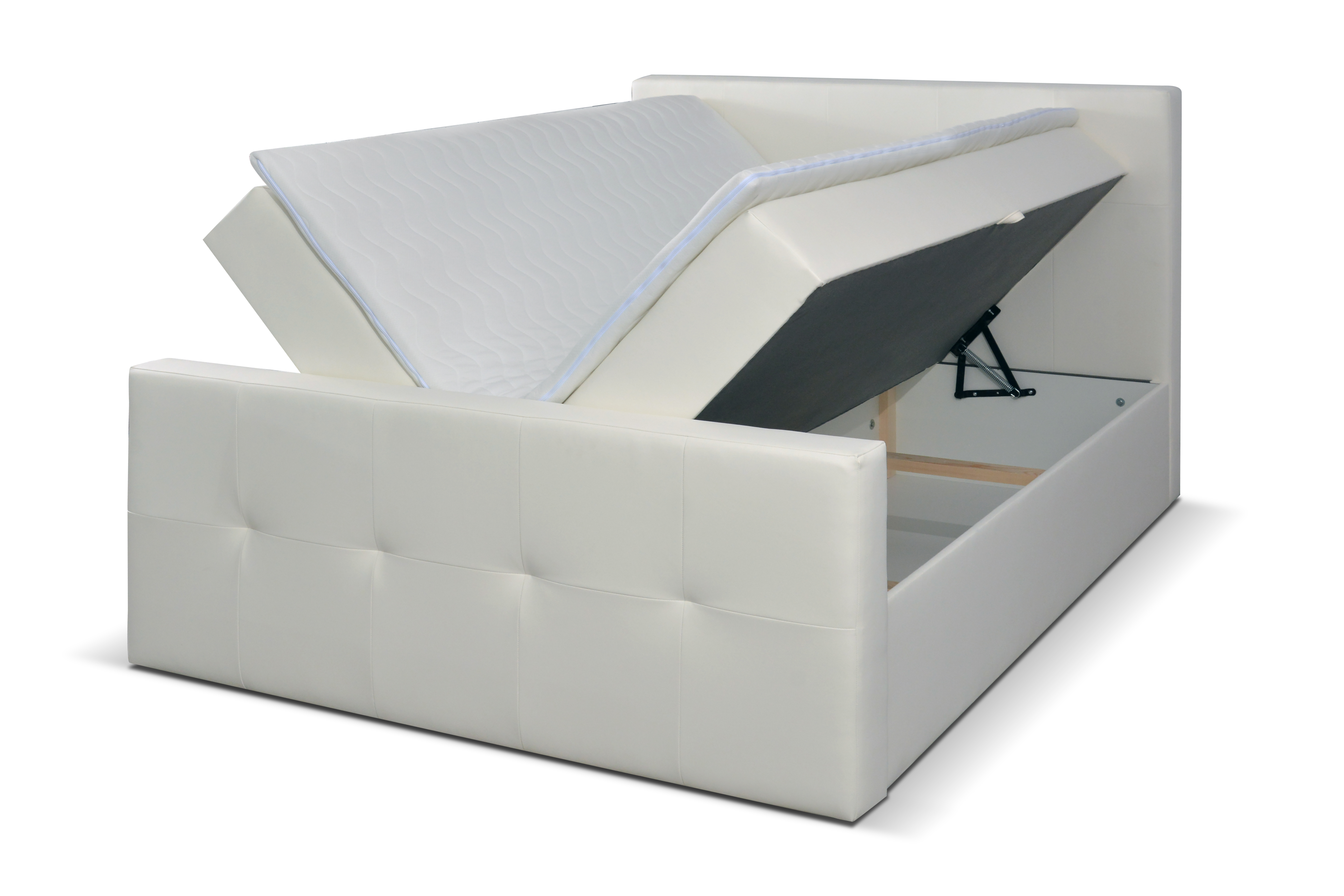 Pohodlná postel robustního designu s dekorativním prošíváním, na které si dopřejete pohodlný spánek. Postel má dva úložné prostory, do kterých si umíte uložit ložní prádlo a jiné doplňky. Postel je vyplněna taštičkovými pružinami a pěnou. K posteli je dodáván bílý topper. Zadní část záhlaví postele je potažena šedou látkou.