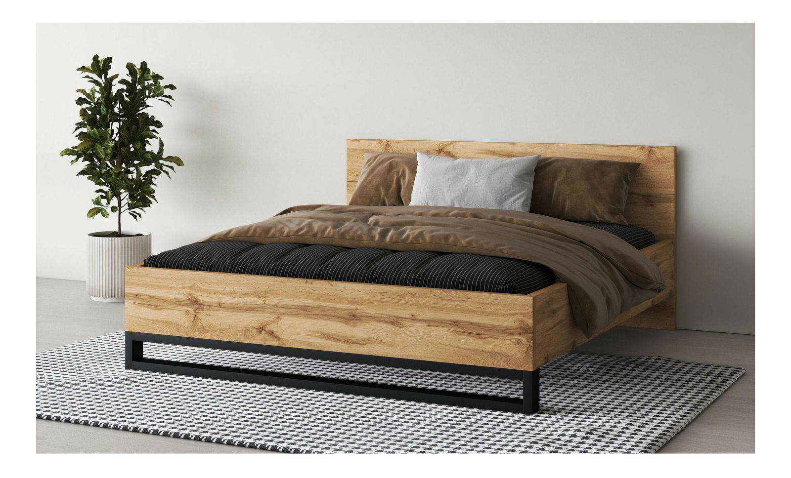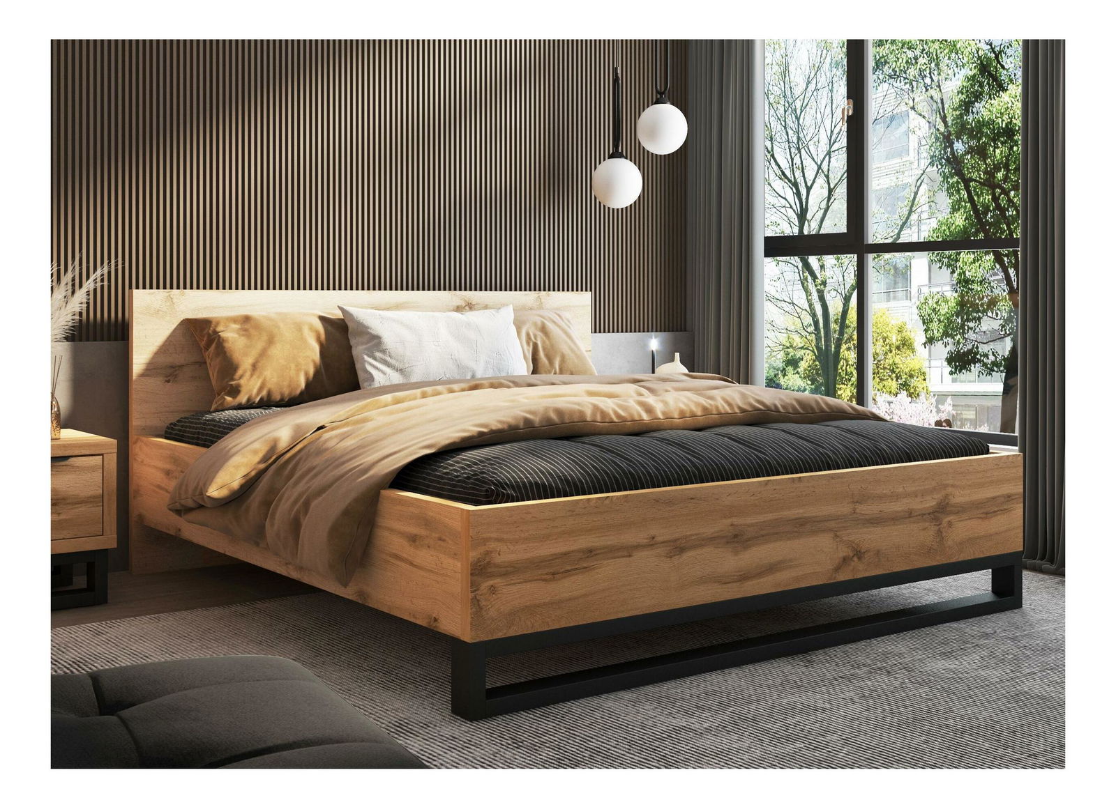 Manželská postel - Helles 180 (dub wotan + černá) - Pohodlná manželská postel s rafinovaným, čistým designem, ideální pro sladké sny. Překližka se vzorem dubu wotan a štíhlé, minimalistické linie dodávají této posteli moderní a zároveň útulný vzhled.
