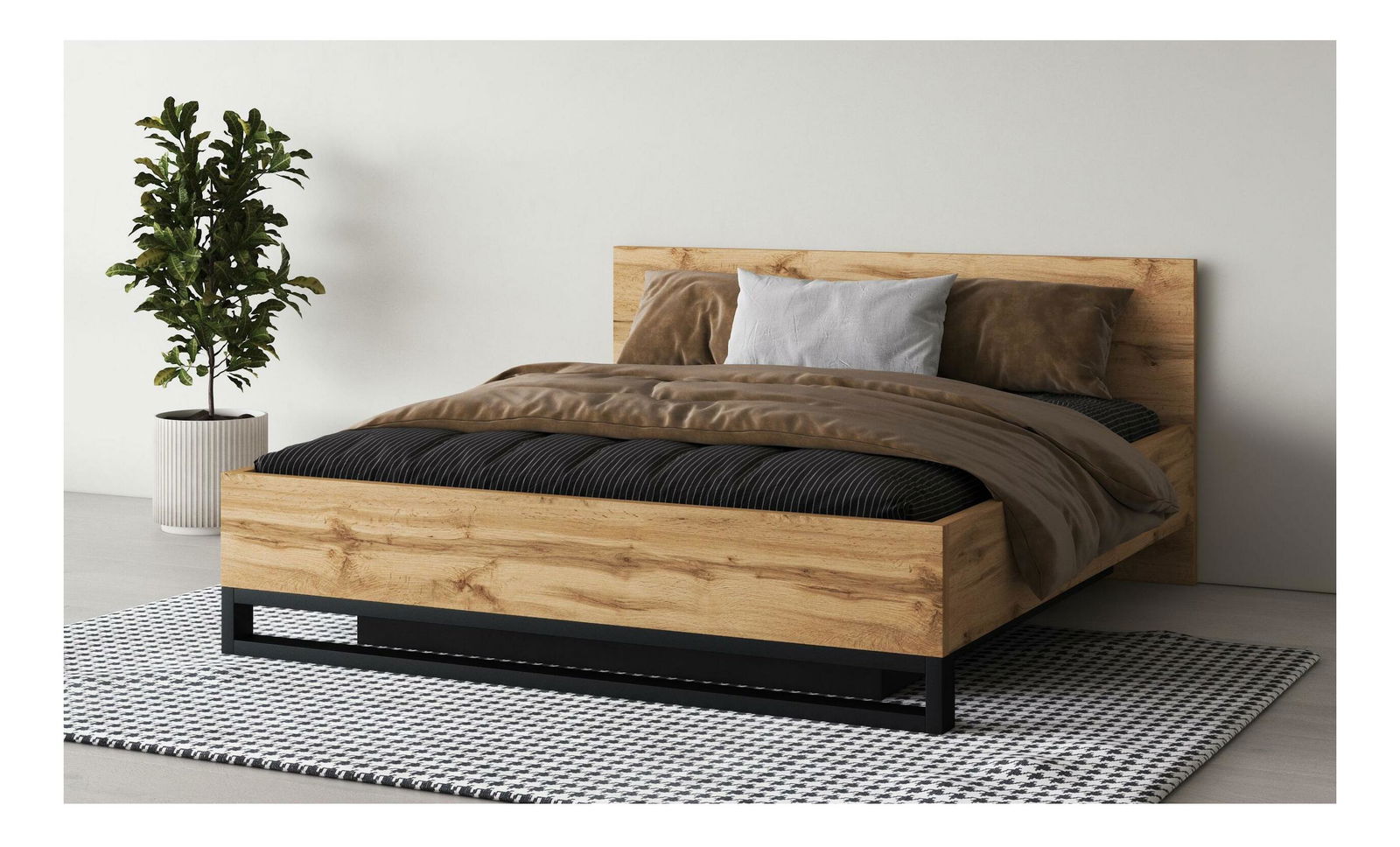 Manželská postel - Helles 180 (dub wotan + černá) (s úložným prostorem) - Pohodlná manželská postel s rafinovaným, čistým designem, ideální pro sladké sny. Překližka se vzorem dubu wotan a štíhlé, minimalistické linie dodávají této posteli moderní a zároveň útulný vzhled.