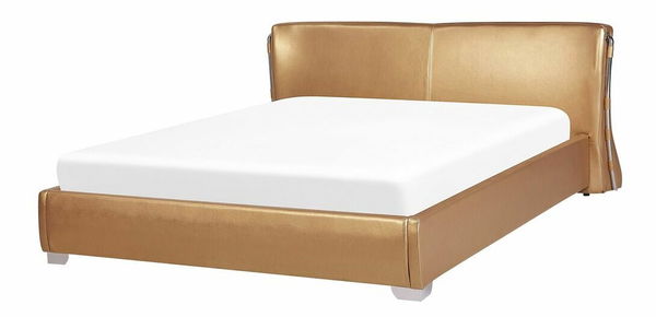 Tato čalouněná kožená vodní postel se stane dokonalým středobodem ložnice. Zlatá barva koženého čalounění vnese do prostoru texturu a teplo a konstrukce z masivního dřeva zaručí stabilitu a klidný spánek. Krátké stříbrné nohy doplňují design postele a lesklý povrch čalounění působí sofistikovaným dojmem.