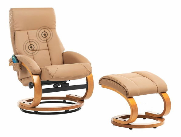 Toto luxusní polohovací křeslo s podnožkou je čalouněno na dotek příjemnou umělou kůží v béžové barvě. Díky svému oblému tvaru a ozdobnému prošívání je ideálním doplňkem do obývacího pokoje i domácí kanceláře. Křeslo s funkcí vyhřívání nabízí 3-bodovou masáž, která je dostupná v 5 režimech a 2 intenzitách, zaručuje pohodlné sezení a podporuje správné držení těla. Všechny funkce lze snadno ovládat pomocí přiloženého dálkového ovladače.