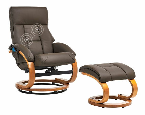 Toto luxusní polohovací křeslo s podnožkou je čalouněno na dotek příjemnou umělou kůží v hnědé barvě. Díky svému oblému tvaru a ozdobnému prošívání je ideálním doplňkem do obývacího pokoje i domácí kanceláře. Křeslo s funkcí vyhřívání nabízí 3-bodovou masáž, která je dostupná v 5 režimech a 2 intenzitách, zaručuje pohodlné sezení a podporuje správné držení těla. Všechny funkce lze snadno ovládat pomocí přiloženého dálkového ovladače.