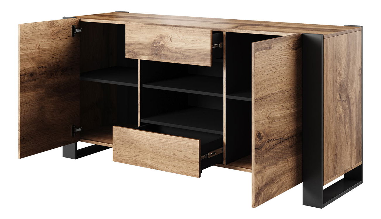 ZobrazitDoménou moderní komody je jedinečný styl, který osvěží vzhled obývacího pokoje a dodá jí průmyslový nádech. Designérský nádech nábytku je způsoben i charakteristickými nohama, která začínají na základně a končí těsně nad vrchem. Tmavé zbarvení podstavce se pojí s odstíny dřeva a vytváří soudržný celek. V rámci obdélníkové komody bylo odděleno několik praktických úložných zón. Základnou jsou prostorné skříňky s dveřmi, které vám umožňují skrýt nahromaděné předměty před očima hostů, kteří vás navštíví. Otevřené police umístěné ve střední části komody poskytují další prostor pro ozdobné dekorace.