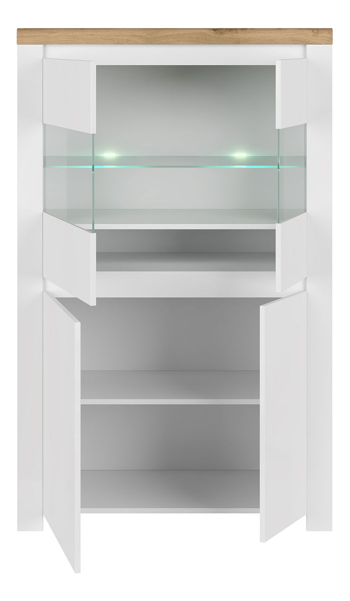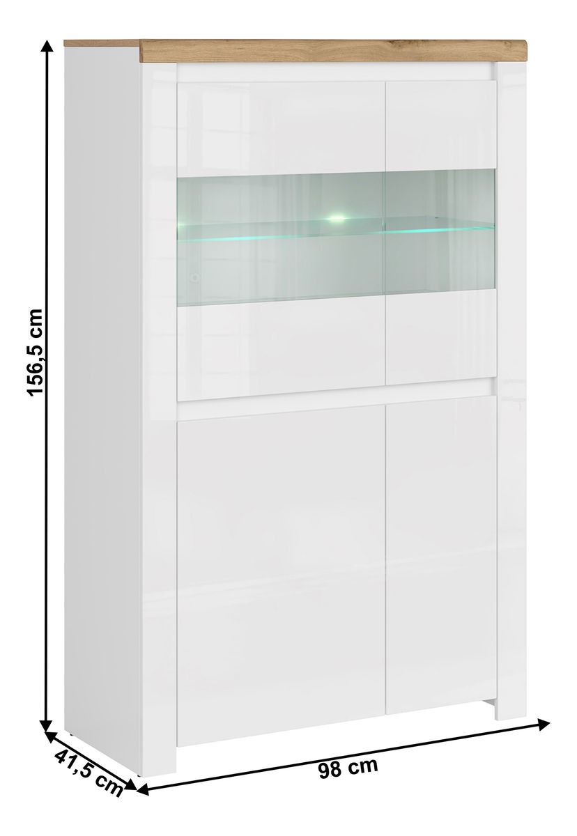 Vitrína Vilgi 2D2W (lesk bílý + dub wotan) o výšce 156,5 cm a šířce 98 cm je ideální pro zařízení obývacích pokojů a jídelen. Její elegantní design a jednoduchost jistě přitáhnou pozornost. Barevná kombinace bílé a dubu wotan dodává vitríně šmrnc a bude to jistě váš oblíbený kousek. Vrchní část je vybavena dvoudveřovou skříňkou se skleněnými dvířky a dvěma poličkami, z nichž jedna je také skleněná. Dolní část má také dvoje dveře a jednu poličku. Vitrína Vilgi 2D2W je součástí sektorového nábytku Vilgi, ale díky jejímu provedení ji snadno zkombinujete s jakýmkoli moderním kouskem ve vaší domácnosti.