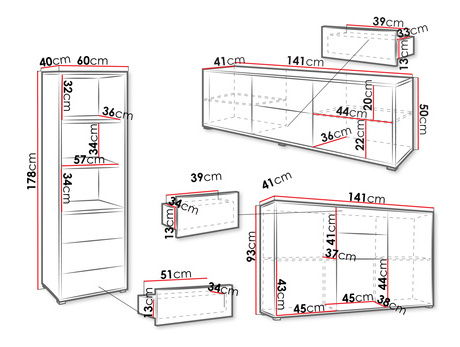 Nábytek do obývacího pokoje je ideální volbou pro ty, kteří hledají pohodlí a styl. Trendová sestava nábytku do pokoje Alekto III je vhodná do malého i velkého obývacího pokoje. Kombinace nejfunkčnějších a nejpotřebnějších prvků v obytném prostoru činí místnost přátelskou pro každou osobu, která ji používá. Souprava se skládá z velké komody a televizního stolku. Je vybavena množstvím skříněk a zásuvek a poskytuje dostatek úložného prostoru. Poskytují úložný prostor pro předměty denní potřeby, elektroniku a slavnostní nádobí. Alekto je také vysoká knihovna, která elegantně vystaví dekorativní doplňky. Souprava obsahuje: Komoda Alekto K3D2SZ AK02: šířka: 141 cm, výška: 93 cm, hloubka: 41 cm, Knihovna Alekto R3SZ AK07: šířka: 60 cm, výška: 178 cm, hloubka: 40 cm, výška stolku Alekto 2D 50 cm, hloubka: 41 cm Design: 16 mm tlustá nábytková deska, PCV lemování, plastové nohy (výška: 2,5 cm), klasické panty, válečkové výsuvy, Systém otevírání "PUSH TO OPEN" Záruka: 24 měsíců