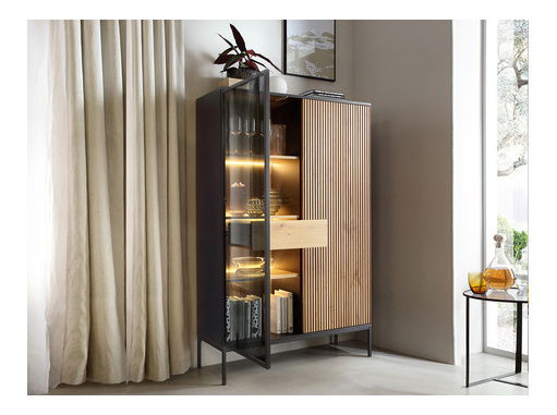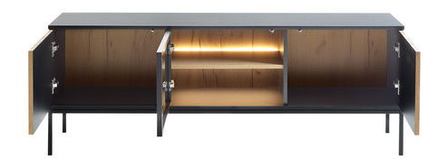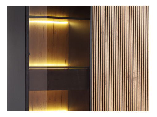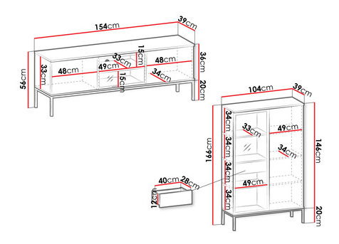 ZobrazitSestava nábytku do obývacího pokoje je ideální volbou pro ty, kteří hledají pohodlí a styl. Když se podíváte na sestavu obývacího nábytku Dornis II, v duchu ji vidíte jako dokonalý doplněk interiéru. Tato dvoudílná souprava, která obsahuje TV skříňku a vitrínu, se skvěle hodí jako prostor pro uložení a vystavení vašich oblíbených dekorací nebo suvenýrů z dovolené. Tato kombinace tvrzeného skla s čely s pravidelným vzorem připomínajícím lamely dodává úžasný vizuální efekt. Úchytky byly nahrazeny systémem otevírání push to open. Vysoké nohy usnadňují úklid a LED osvětlení, které v sadě dostanete, je skvělou možností pro vytvoření klimatické atmosféry v interiéru. Sestava se skládá z následujících prvků: TV skříňka Dornis RTV154: šířka: 154 cm, výška: 56 cm, hloubka: 39 cm, Vitrína Dornis WTSZ104: šířka: 104 cm, výška: 166 cm, hloubka: mm tl. + tvrzené sklo, korpus: laminovaná deska o tloušťce 16 mm, ocelový rám práškově lakovaný černý, profil 18 mm, ABS hrany, panty HAFELE, kuličková ložisková vedení h-45 plnovýsuv HAFELE, žádné rukojeti, otevírací systém "PUSH TO OP
