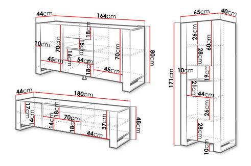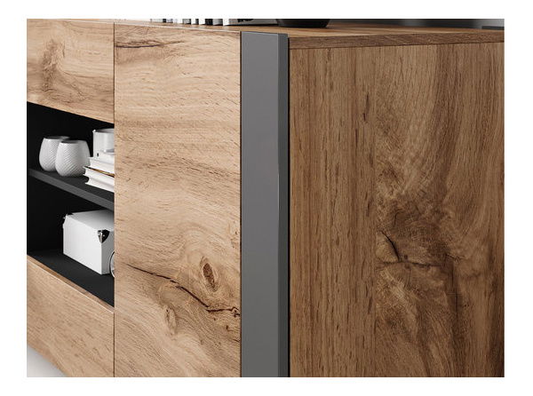 ZobrazitNábytek do obývacího pokoje je ideální volbou pro ty, kteří hledají pohodlí a styl. Sestava obsahuje tyto prvky: Vitrína Empire: šířka: 65 cm, výška: 171 cm, hloubka: 40 cm, Komoda Empire: šířka: 164 cm, výška: 80 cm, hloubka: 44 cm, TV skříňka Empire: šířka: 180 cm, výška: 48 cm, hloubka: hloubka: lamely) - matná laminovaná dřevotříska tloušťka 16 mm, vpředu - 16 mm silná matná laminovaná dřevotříska, žádná držadla (přední strany mírně vyčnívají), nohy: 16 mm silná antracitová laminovaná deska, univerzální zobrazovací jednotka: dají se nainstalovat přední