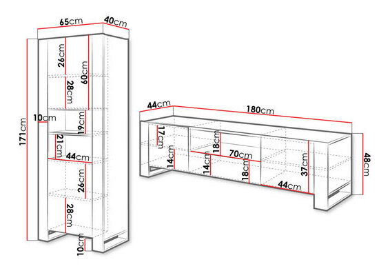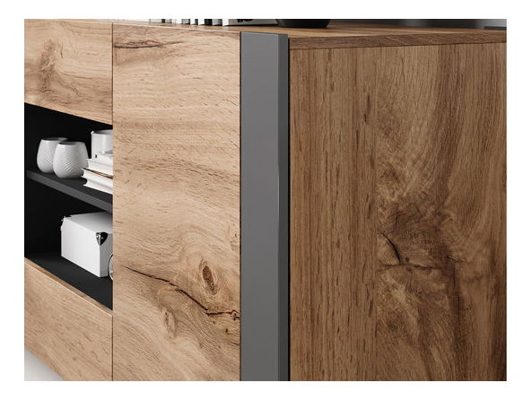 ZobrazitPři zařizování bytu v industriálním nebo loftovém stylu vsaďte na nábytek s duší! Nábytek do obývacího pokoje Elexia je vynikající nabídkou pro dnešní aranžmá. Poskytuje dostatek úložného prostoru, je vyroben z odolných materiálů a v interiéru vypadá úžasně. Barevné provedení nábytku Empire dokonale imituje barvu přírodního dřeva, které bylo rozbito vložkami v antracitové barvě, což dodává místnosti charakter. V sadě najdete prostornou TV skříňku, ve které budou vystavena elektronická zařízení, a vysokou vitrínu, do které můžete uložit dekorace nebo rodinné fotografie a vzpomínkové předměty.