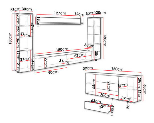 Obývačkový nábytek je ideální volbou pro ty, kteří hledají pohodlí a styl. Rozměry prvků: Vitrína ( x 2 ): šířka: 30 cm, výška: 130 cm, hloubka: 33 cm, Závěsná police: šířka: 127 cm, výška: 18 cm, hloubka: 12 cm, Skříň RTV: šířka: 180 cm, výška: 30 cm, výška: 30 cm šířka: 150 cm, výška: 68 cm, hloubka: 39 cm Design: laminovaná deska 15 mm, čela: matná nebo polyglosová deska 15 mm, okraje z ABS, zadní okraj z papíru, model bez držadel, otevírání pomocí předních částí vyčnívajících nad tělo, standardní závěs, standardní závěs TO OPEN", skříňky a skříňka RTV jsou univerzální - lze je zavěsit nebo postavit (nožičky jsou zahrnuty v ceně), nožičky: plast hliníkové barvy (výška 2 cm), osvětlení SQAURE LED jako dodatečná možnost za příplatek Záruka: 24 měsíců