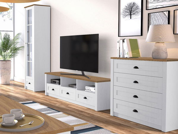 ZobrazitSada nábytku je ideální volbou pro ty, kteří hledají pohodlí a styl. Sada nábytku Patty IV nabízí tři kusy. První z nich je komoda se čtyřmi šuplíky. Druhým kusem nábytku je TV stolek, který dokonale zobrazí televizor a poskytne další úložný prostor. Soupravu doplňuje vysoká vitrína se skleněnou přední částí. Díky němu si budete moct zobrazit své oblíbené objekty. Kromě toho je můžete zvýraznit výběrem osvětlení LED. Díky použitým barvám vnáší nábytek do obývacího pokoje Patty do interiéru nádech útulnosti. Za zmínku stojí i úchyty ve tvaru mušlí na zásuvkách. Rozměry: Vitrína Patty W1S PA18: šířka: 50 cm, výška: 198 cm, hloubka: 43 cm, TV stolek Patty: šířka: 158 cm, výška: 49 cm, hloubka: 43 cm, Komoda Patty K4: šířka: 88 cm, výška: 87 cm laminovaná dřevotříska, horní část: 36 mm laminovaná dřevotříska, MDF lišta, 2,5 mm lakovaná deska HDF, lemování: ABS dýha, kliky: dveře - knoflík, zásuvky - mušlovité, jednoduché panty bez tichého zavírání, kolejničky s kuličkami, osvětlení jako doplňková možnost za příplatek Záruka: 24 měsíců
