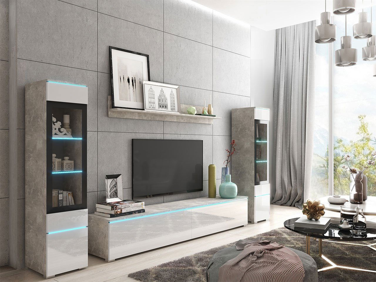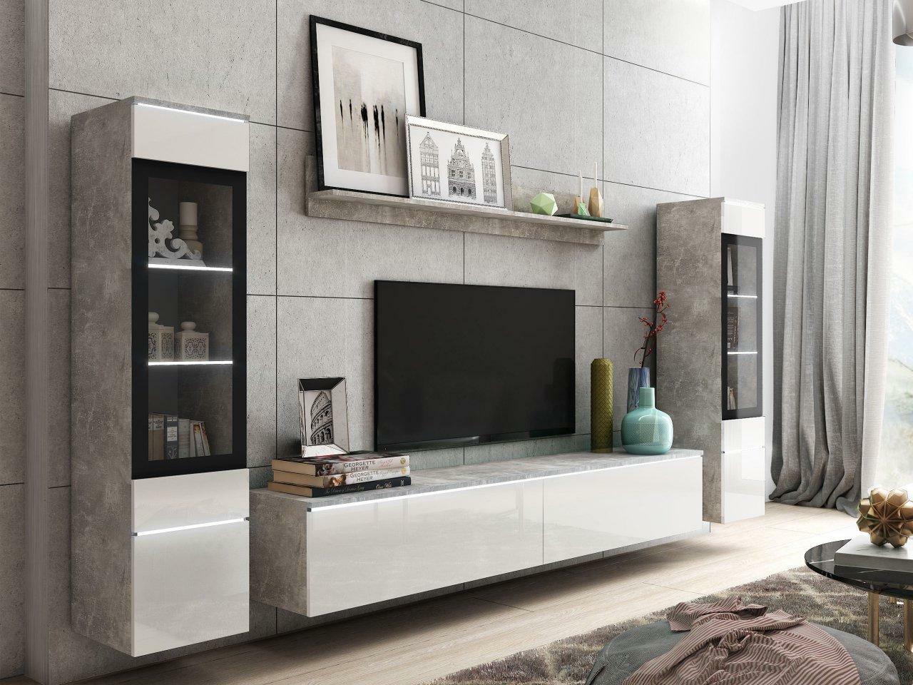 Nábytek do obývacího pokoje Selwyn II (beton + bílý lesk) (osvětlení led bílé)