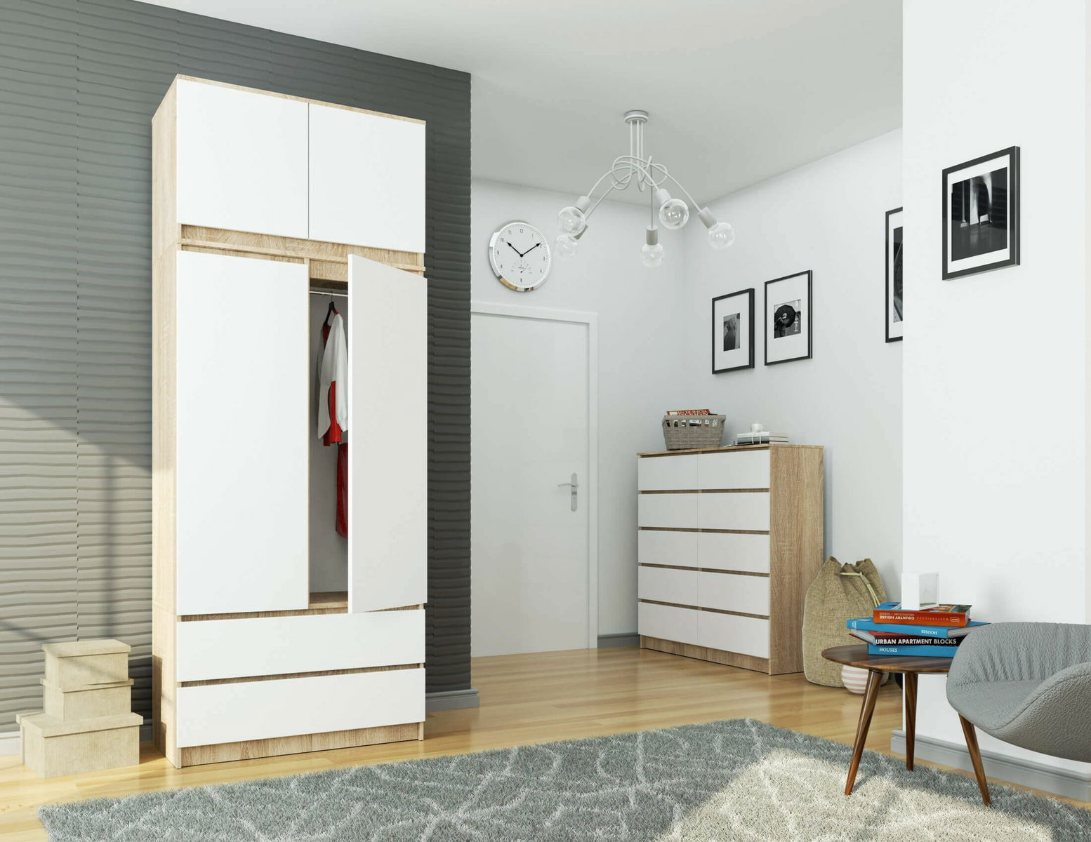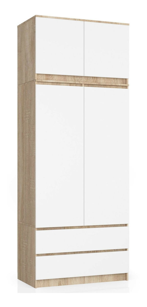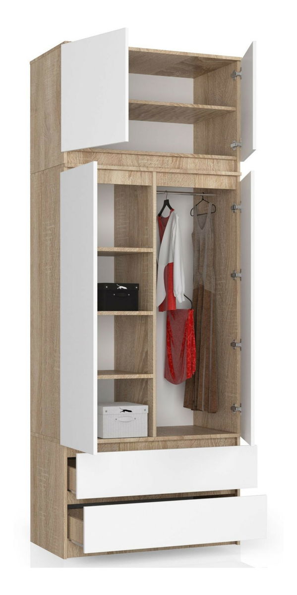 Zobrazit90 cm šatní nástavec Sashka se 2 dvířky je dokonalým řešením pro lidi, kteří chtějí zvýšit funkčnost svého stávajícího nábytku. Skříň se šuplíky, prostorem na ramínka na šaty a policemi je poměrně prostorná. Šatní nástavec je vyroben z oděru odolné laminované desky. Okraje nástavce jsou pečlivě upraveny odolnou ABS dýhou. Šatní skříň s nástavcem působí velmi efektně a lze ji umístit nejen do ložnice či na chodbu, ale také na reprezentativnější místo domu, jakým je obývací pokoj. Nábytek dobře poslouží v malých bytech, kde je velmi důležité racionální využití prostoru.