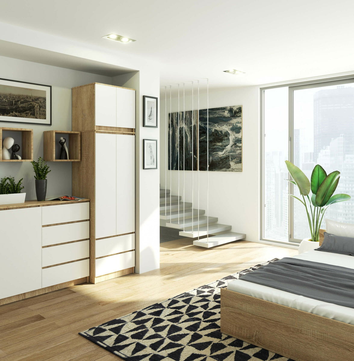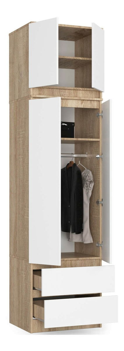 Zobrazit60 cm šatní nástavec Sashka II s dvířky je dokonalým řešením pro lidi, kteří chtějí zvýšit funkčnost svého stávajícího nábytku. Skříň se šuplíky, prostorem na ramínka na šaty a policemi je poměrně prostorná. Šatní nástavec je vyroben z oděru odolné laminované desky. Okraje nástavce jsou pečlivě upraveny odolnou ABS dýhou. Šatní skříň s nástavcem působí velmi efektně a lze ji umístit nejen do ložnice či na chodbu, ale také na reprezentativnější místo domu, jakým je obývací pokoj. Nábytek dobře poslouží v malých bytech, kde je velmi důležité racionální využití prostoru.