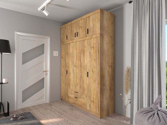 Nástavba na šatní skříň Elanor IV v dubovo-bílé barvě je ideální volbou pro ty, kteří potřebují zvětšit úložný prostor ve skříni. S výškou 55 cm a hloubkou 53 cm poskytuje dostatek místa pro uložení dalších věcí. Materiál korpusu je laminát v dubovém provedení Lefkas a přední strana je rovněž z laminátu ve stejné barvě. Plastové úchyty jsou praktickým doplňkem k této nástavbě. V nabídce jsou i další barevná provedení. S touto nástavbou budete mít více místa pro své oblečení a doplňky.
