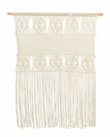 Tato bavlněná makramé dekorace na zeď ve světle béžové barvě dokonale vystihuje charakter boho stylu. Je ručně vyrobena z kvalitní bavlny a její složité uzly vyrobené technikou makramé dohromady vytvářejí stylový doplněk v boho stylu. Díky pevné dřevěné liště se šňůrkou ji lze bez námahy zavěsit kamkoli na zeď.