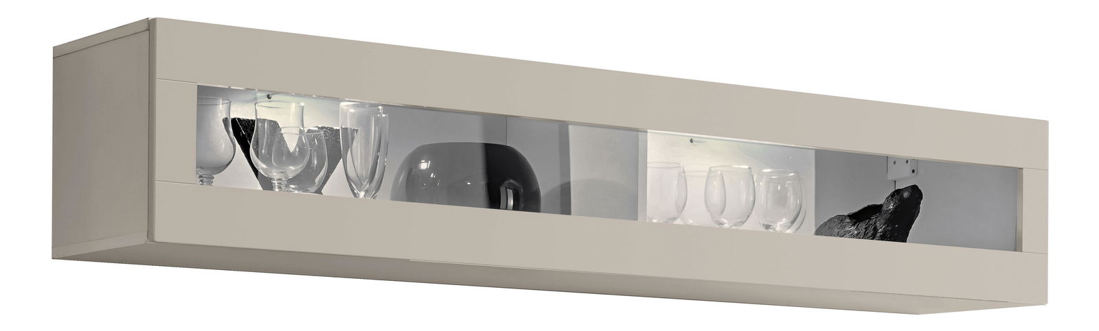 Moderní vitrína na stěnu s částečně prosklenou přední stranou v nadčasovém odstínu kašmíru a praktickým výklopným otevíráním nahoru pomocí plynových vzpěr je ideálním řešením pro každý obývací pokoj, kuchyni či předsíň. Vnitřek vitríny je rozdělen na dvě části, které jsou osvětleny bílým LED světlem, díky čemuž vynikne každý detail. Díky bezúchytkovému systému push-click je otevírání i zavírání jednoduché, tiché a pohodlné – stačí jemně zatlačit na přední část. Rozměry předního skla: 147,5 × 13,7 cm. Nábytek v odstínu kašmír vnáší do prostoru nádech elegance a jemného luxusu, aniž by působil okázale. Ideální je pro milovníky minimalismu, skandinávského nebo moderního stylu. Díky kombinaci designu a funkčnosti je tento nábytek ideálním řešením pro každý moderní interiér.