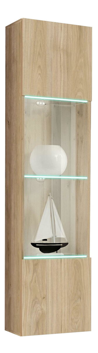Moderní vitrína na stěnu je skvělým doplňkem do obývacího pokoje, jídelny či předsíně. Uvnitř se nacházejí tři skleněné police, ideální na vystavení dekorací, skla nebo oblíbených doplňků. Elegantní vzhled podtrhuje bílé LED osvětlení, které dodá vašim vystaveným předmětům ještě větší lesk. Vitrína je vybavena bezúchytkovým systémem push-click, otevírání je tak pohodlné a plynulé. Díky univerzální montáži dvířek si můžete při instalaci zvolit, zda se budou otevírat na pravou nebo levou stranu, podle vašich potřeb.