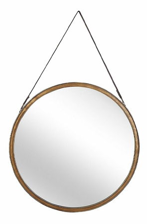 Toto kulaté zrcadlo ve zlaté barvě je praktickým a zároveň dekorativním bytovým doplňkem do obývacího pokoje, předsíně nebo ložnice. Umístěte jej oproti oknu, aby se místnost zdála světlejší a prostornější, nebo jej zavěste nad toaletní stolek, abyste měli při líčení dostatek světla. Zrcadlo je vyrobeno z vysoce kvalitního skla a broušeného železa. Elegantní tmavě hnědý řemínek z umělé kůže usnadňuje zavěšení a dodává zrcadlu jedinečné kouzlo.