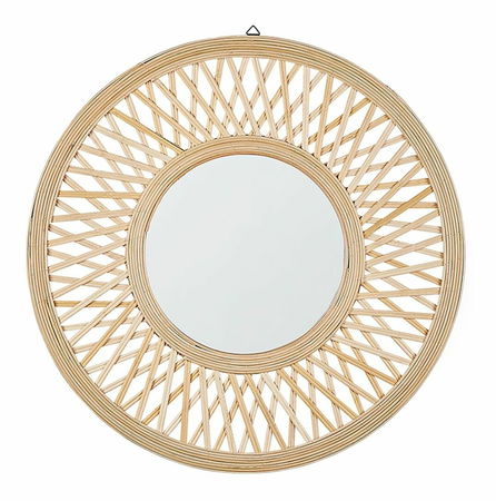 Toto zrcadlo v klasickém nadčasovém stylu jistě doplní kaźdou chalupu a tradiční interiér. Jeho ručně vyrobený bambusový rám je opravdu poutavým akcentem. Tvar a geometrický vzor inspirovaný slunečním zářením dodávají kousku moderní nádech. Zadní strana je vybavena háčkem na zavěšení.
