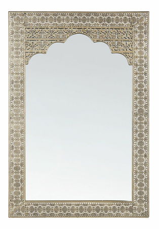 Nádherné nástěnné zrcadlo s rámem inspirovaným marockým stylem vnese do interiéru orientální atmosféru. Zrcadlo má krásně zpracovaný rám vyrobený z odolného kovu v hřejivém zlatém odstínu, díky čemuž bude ladit se zařízením v moderním, orientálním nebo vintage stylu. Lze jej zavěsit v obývacím pokoji, ložnici nebo předsíni a zkrášlit dekoraci celé místnosti.