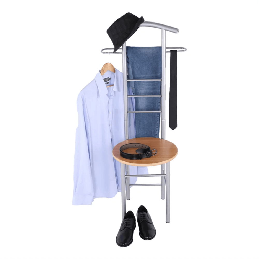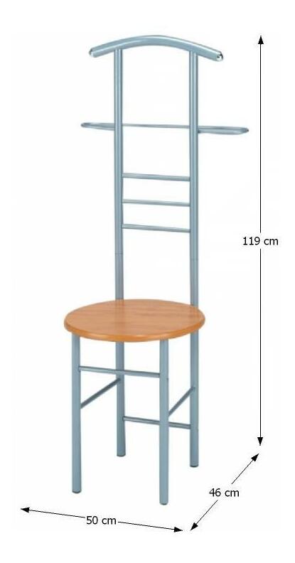 Němý sluha Feno je praktická židle, která slouží jako věšák a je ideální do předsíni, pokoje nebo ložnice. Tato židle má kovovou konstrukci stříbrné barvy a sedák z foliované MDF v barvě buku. Rozměry židle jsou 50x46x119 cm. Dodává se v demontu. Materiály, které byly použity k výrobě židle jsou kov a MDF fóliovaná. Židle Němý sluha Feno je praktický a moderní doplněk do každého interiéru.