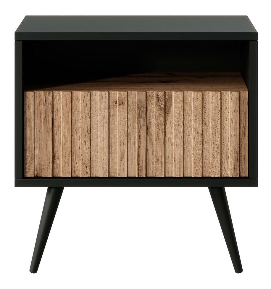 ZobrazitMáte rádi klasický nábytek s moderním nádechem svěžesti? Výběrem kolekce vnesete do svého interiéru elegantní, ale klasický vzhled! Noční stolek bude skvělou volbou pro lidi, kteří chtějí změnit svoji ložnici. Nábytek má otevřený výklenek a prostornou zásuvku, kam schováte všechny nejpotřebnější věci. Další výhodou je prostorná deska, na kterou si můžete položit knihu nebo telefon. Čelo má vkusný dekor v podobě lamel, dodává nábytku originální vzhled. Detaily produktu: maximální zatížení zásuvky a prohlubně: 3 kg, a vrchní části: 8 kg, korpus a čela z nábytkové desky, černé nohy o výšce 18 cm dodávají nábytku eleganci a usnadňují udržování pořádku, matné provedení čel a korpusu, nábytek pro svépomocnou montáž .