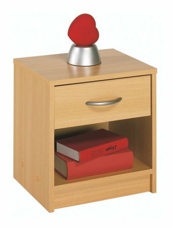 Jednoduchý noční stolek v bukovém provedení s jednou zásuvkou v horní části a poličkou v části dolní.