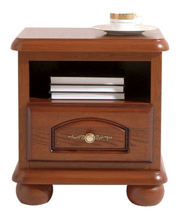 Noční stolek vznešného a ozdobného designu, kterým si zkrášlíte vaši ložnici. Má oblé vyřezávané hrany, na dvířkách je ozdobný výřez a úchyt. Stolek má otevřenou poličku na odkládání knih nebo drobností, které chcete mít vždy po ruce. Stolek stojí na hrubších nožičkách.