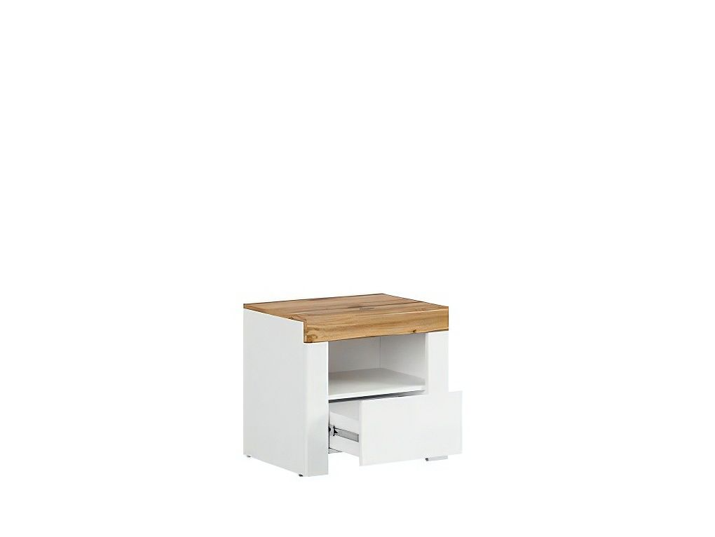 Noční stolek nabízí jednu otevřenou polici a jednu uzavřenou zásuvku. Při otevírání zásuvky ihned pocítíte ten nejvyšší komfort, protože vodící koleje umožňují úplný výsuv a tichý doraz. Barevné provedení bílého lesku a dizajn v kombinaci s dubem wotan působí nadčasově trendově. Barevné provedení bílého lesku a design v kombinaci s dubem Wotan působí nadčasově trendově. Materiál: Nábytková deska.