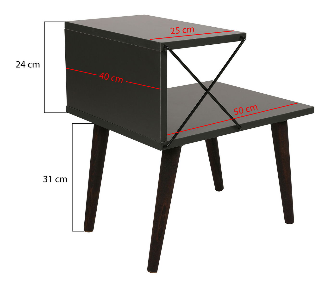 Noční stolek - Crossline (Antracit) je praktickým a elegantním doplňkem do vašeho interiéru. S výškou 55 cm, šířkou 50 cm a hloubkou 40 cm poskytuje dostatek místa pro uskladnění vašich osobních věcí jako knížky, časopisy, brýle a další. Jeho antracitový odstín dodává místnosti moderní a stylový vzhled. Stolek je vyroben z kvalitního materiálu, díky čemuž je pevný a odolný. S jeho jednoduchým, ale elegantním designem se hodí do různých interiérových stylů. Bezvadná kombinace funkčnosti a stylu, která ocení každý zákazník.