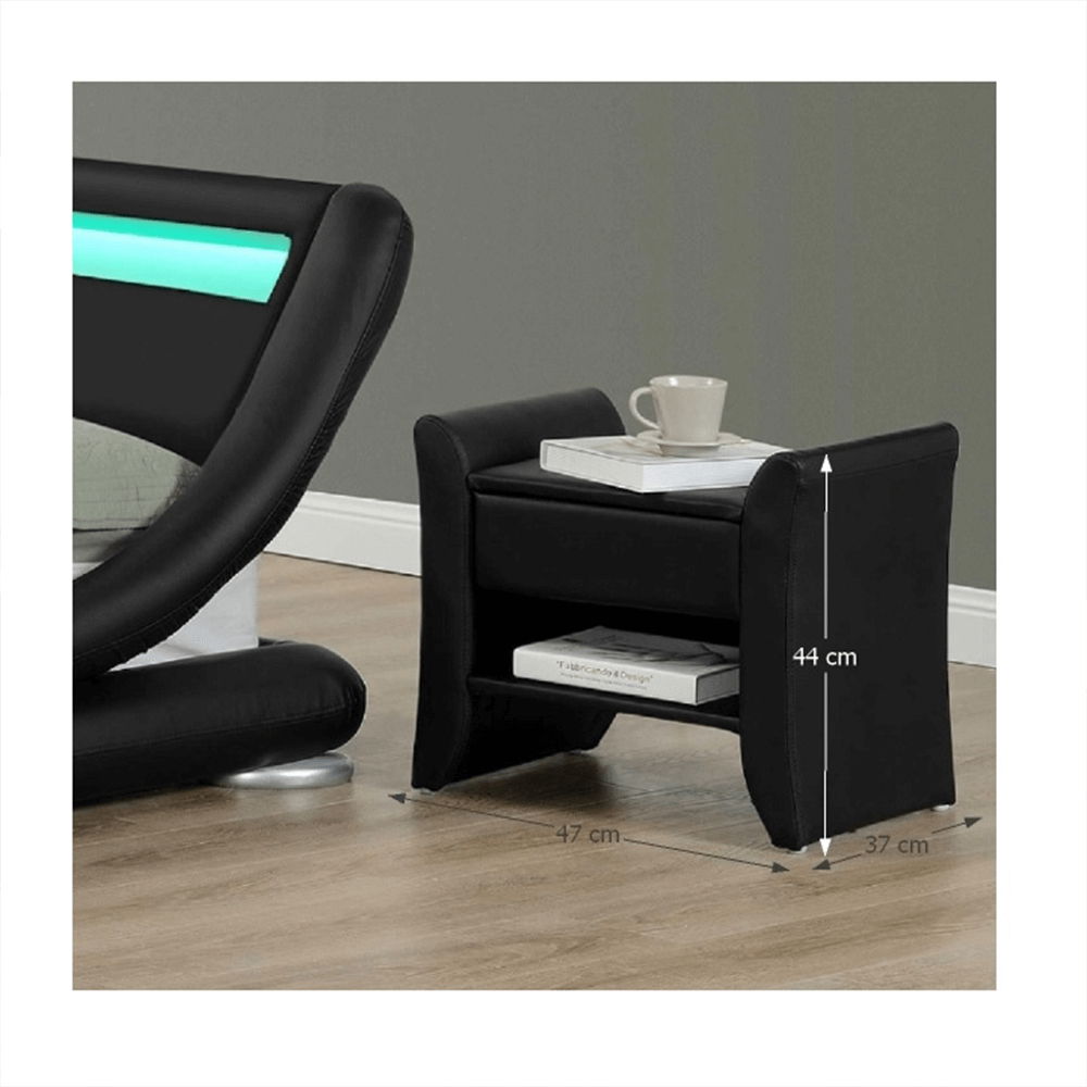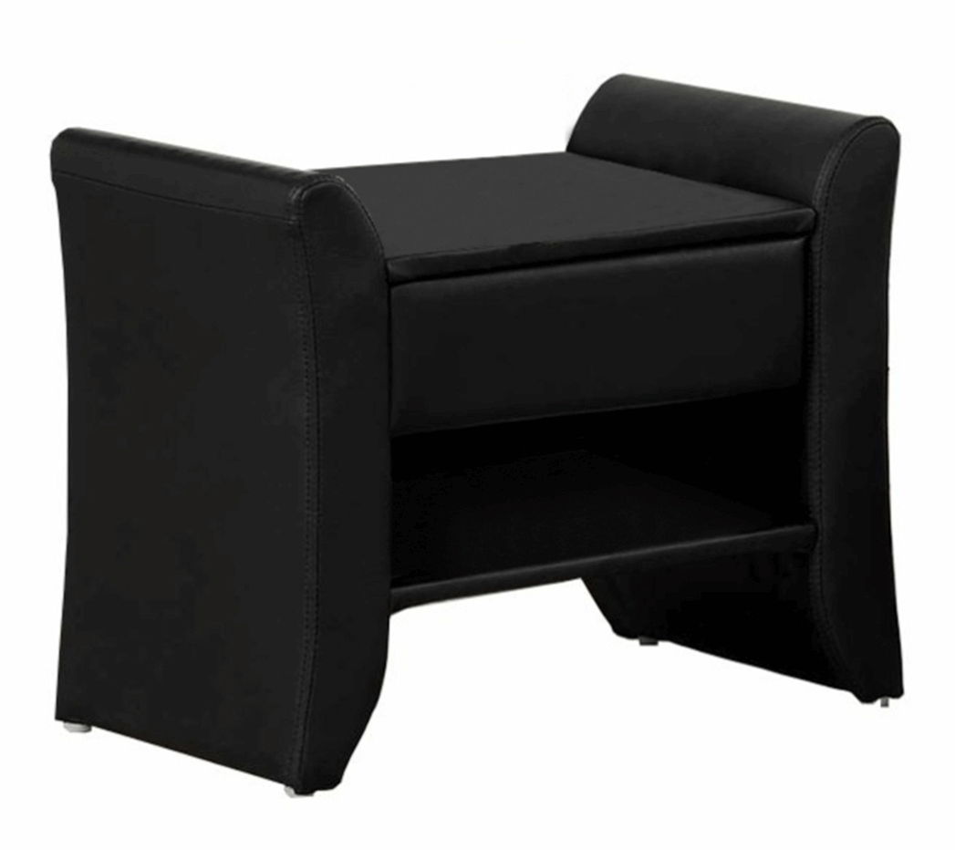 Elegantní noční stolek je čalouněný ekokůží, která je nenáročná na údržbu a působí příjemně. Tento noční stolek je jedinečný i svým úložným prostorem, který zajišťuje jedna zásuvka a jeden otevřený prostor. Jeho design se prezentuje pěkně tvarovanými křivkami, které zvýrazňuje černá koženka. Tato univerzální barva se hodí kdekoliv a dodá místnosti nádech tajemnosti.