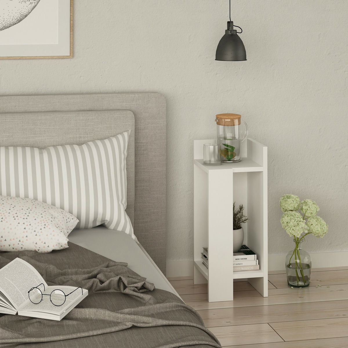 Noční stolek Elloy (bílá) o výšce 60 cm, šířce 25 cm a hloubce 27 cm je perfektním doplňkem každé ložnice. Díky svému minimalistickému designu se dokonale hodí do každého interiéru. Stolek je vyroben ze 100% melaminové desky, která zaručuje dlouhou životnost a odolnost v každodenním používání. S jednou zásuvkou a otevřeným prostorem nabízí dostatek místa pro uložení knih, časopisů nebo mobilního telefonu. Bílá barva stolku Elloy vytváří moderní a elegantní vzhled, který bude lákat vaše oko každý den.