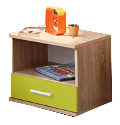 Jednoduchý noční stolek Emio vhodný do dětských a studentských pokojů. Má otevřenou poličku na odkládání věcí a menší zásuvku. Barevné provedení stolku je dub sonoma a zelená.