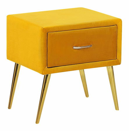 S tímto nočním stolkem vytvoříte ve své ložnici okouzlující atmosféru. Stolek je vyroben z odolného sametu, který se snadno udržuje, a díky svému designu jistě upoutá pozornost. Žlutou barvu čalounění doplňují zlaté nohy vyrobené ze železa, které zajišťují stabilitu. Zásuvku, která je součástí stolku, lze využít jako odkládací prostor pro knihy či jiné drobnosti.