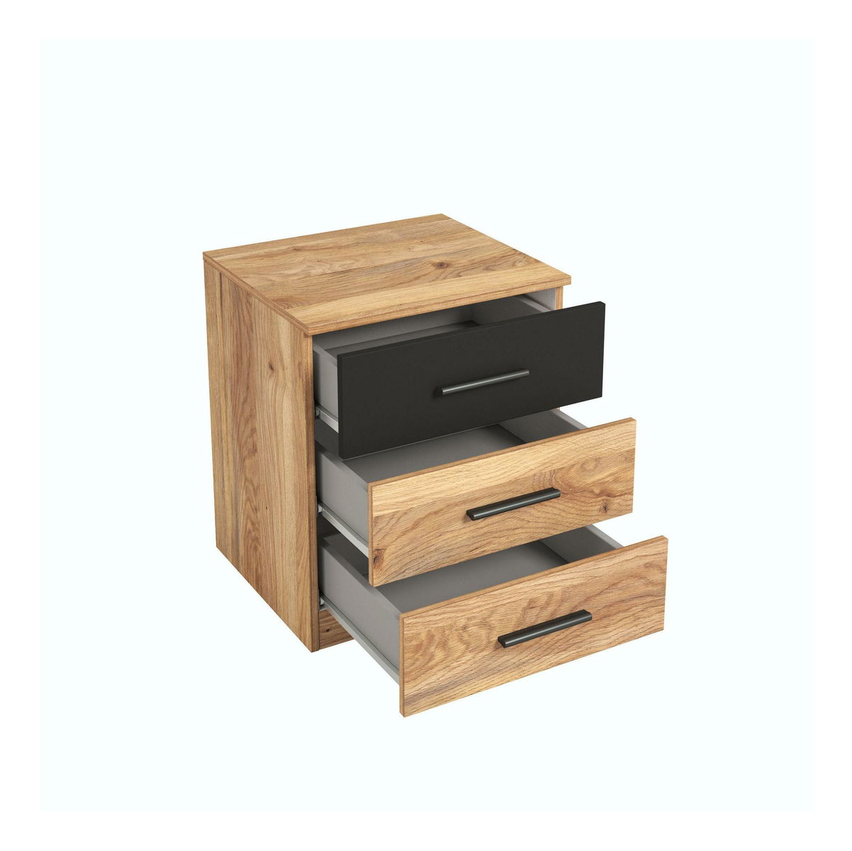 Noční stolek - Gamma (dub + černá) - Stylový noční stolek se třemi zásuvkami, ideální do každé moderní ložnice. Kompaktní rozměry a štíhlé minimalistické úchytky dodávají tomuto nočnímu stolku moderní a zároveň útulný vzhled.
