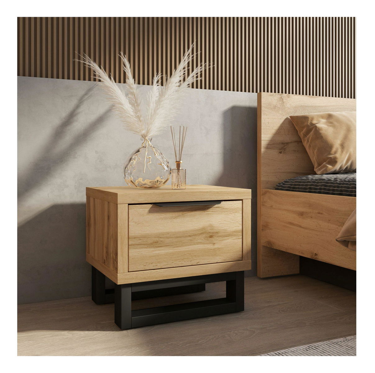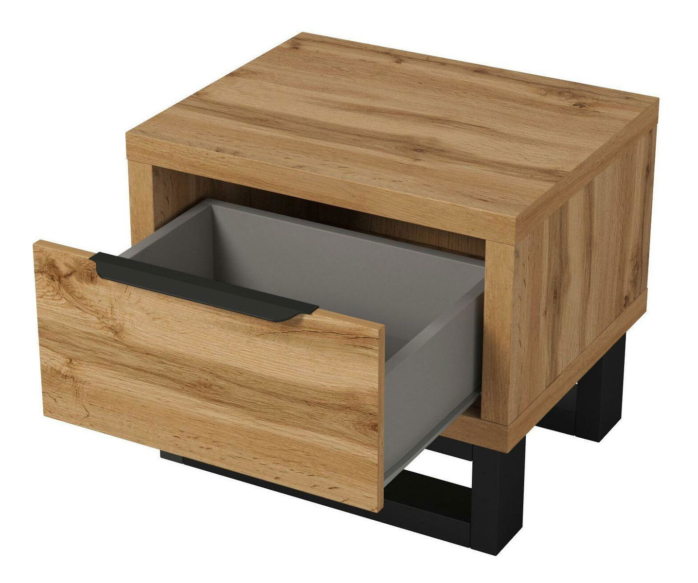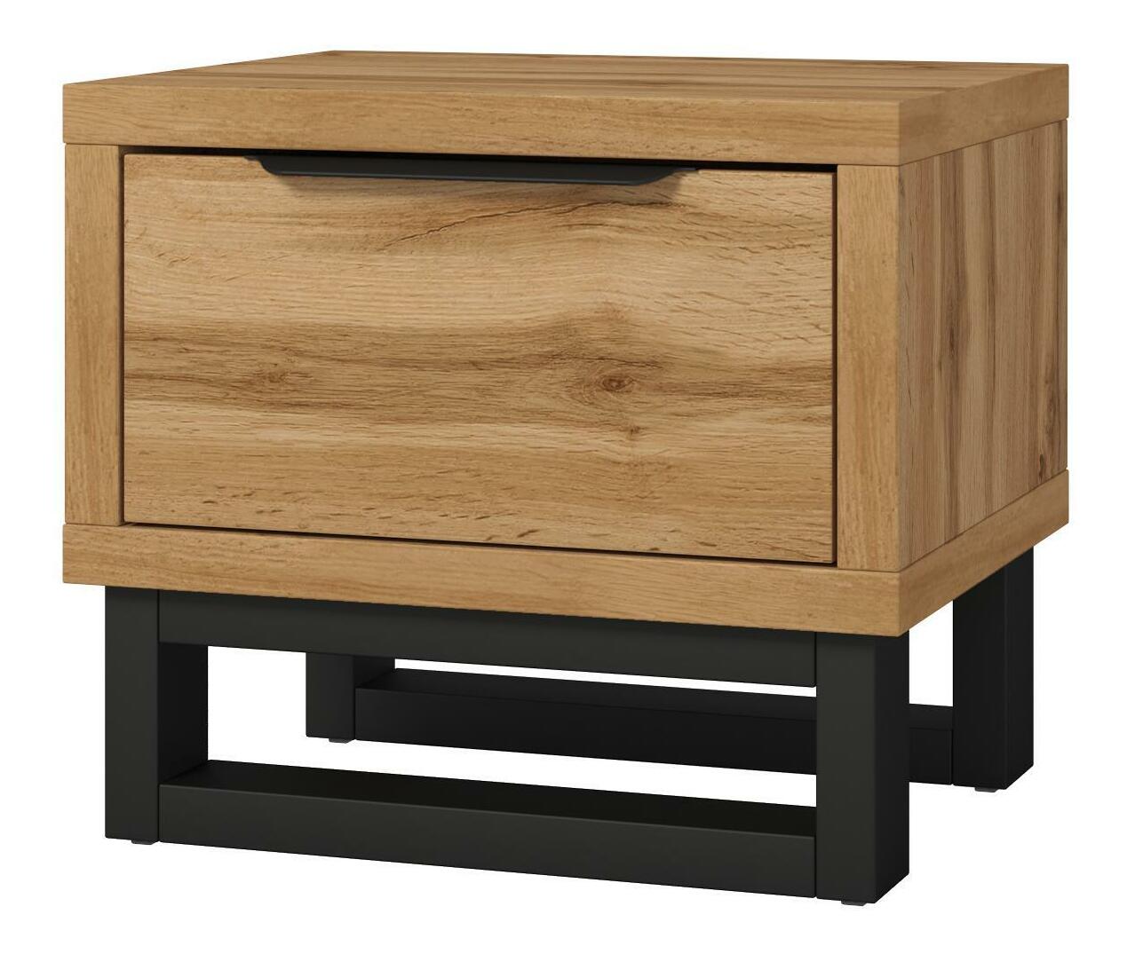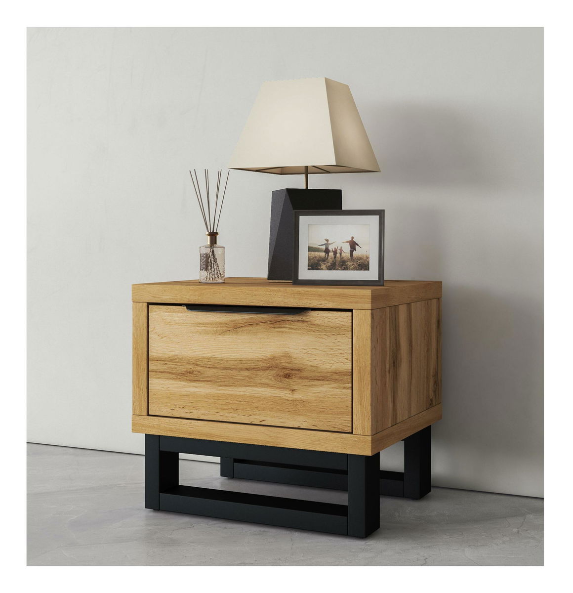 Noční stolek - Helles (dub wotan + černá) - Stylový noční stolek s jednou zásuvkou, ideální do každé moderní ložnice. Překližka se vzorem dubu wotan a štíhlé, minimalistické úchytky dodávají tomuto nočnímu stolku moderní a zároveň útulný vzhled.