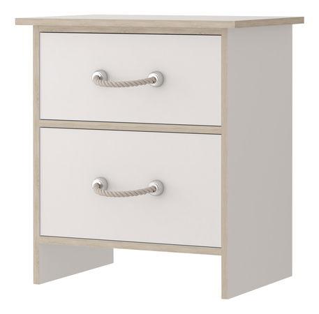 Noční stolek - Klaudia 22 (bílá + dub sonoma) je vyroben v minimalistickém a námořnickém stylu. Je součástí série Klaudia a má výšku 64 cm, šířku 54 cm a hloubku 40 cm. Tento stolek je vyroben z 16 mm silné kvalitní laminované desky s ABS hranami, což zaručuje jeho odolnost. Jeho unikátní design s úchyty z lana dodává námořnický nádech. Stolek nemá nožičky, ale má prodloužené boční stěny, které zajišťují stabilitu. Svým dvěma zásuvkami poskytuje dostatek úložného prostoru a zároveň si udržuje čistý a snadný vzhled.