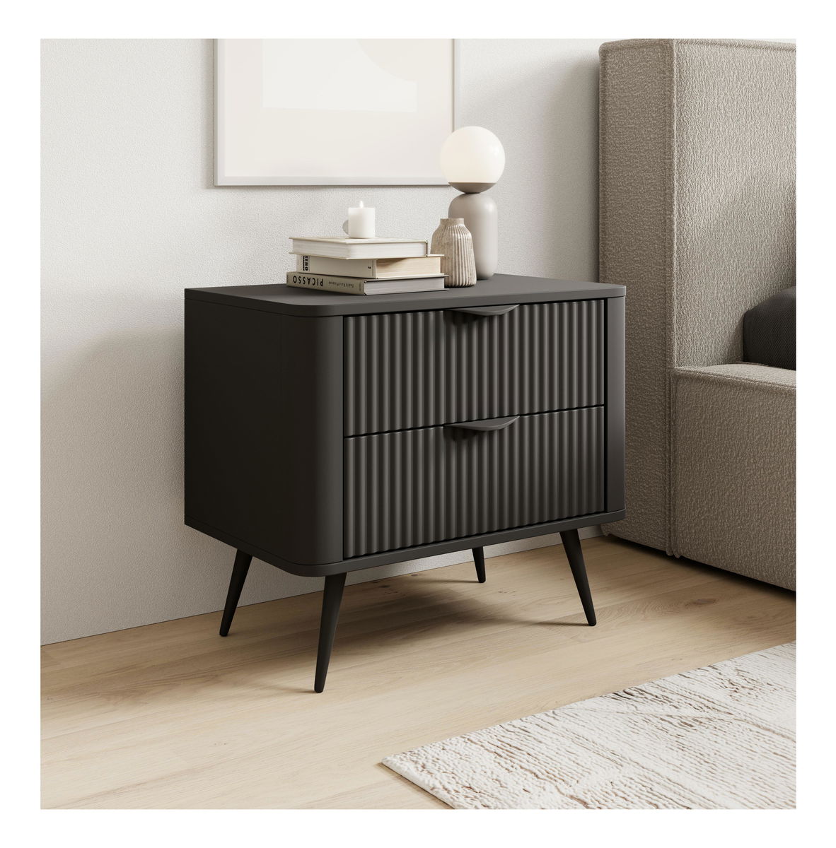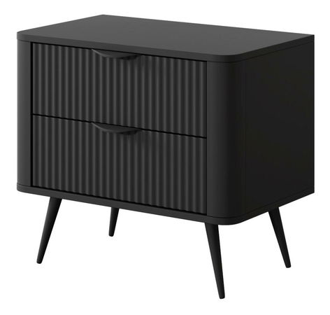 Nočný stolík Lethe I (čierna) je elegantným a praktickým doplnkom vašej spálne. Vyrobený z laminovanej drevotriesky, s MDF hrúbkou 16 mm po stranách a 18 mm na prednej časti, zaručuje pevnosť a odolnosť. Stolík disponuje 2 zásuvkami, ktoré poskytujú dostatok úložného priestoru. Zlaté kovové úchytky a nožičky dodávajú luxusný nádych a stabilitu. Tento nočný stolík kombinuje moderný dizajn a funkčnosť, ideálny pre každodenné použitie.