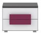 Noční stolek se dvěma zásuvkami s výraznými fialovými úchyty.